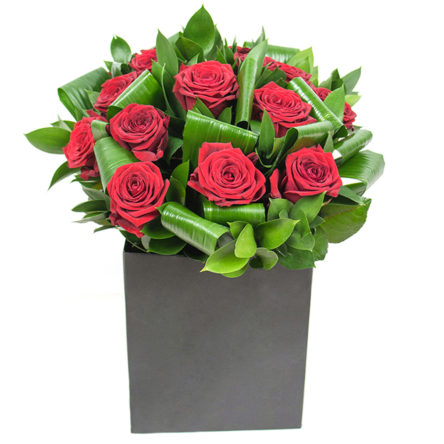 Bring sophistication and grace to any setting with our Sophisticated Red Rose Flower Arrangement. This exquisite bouquet combines rich red roses, vibrant aspidistra leaves, and fresh ruscus to create a stunning display that captivates and delights.