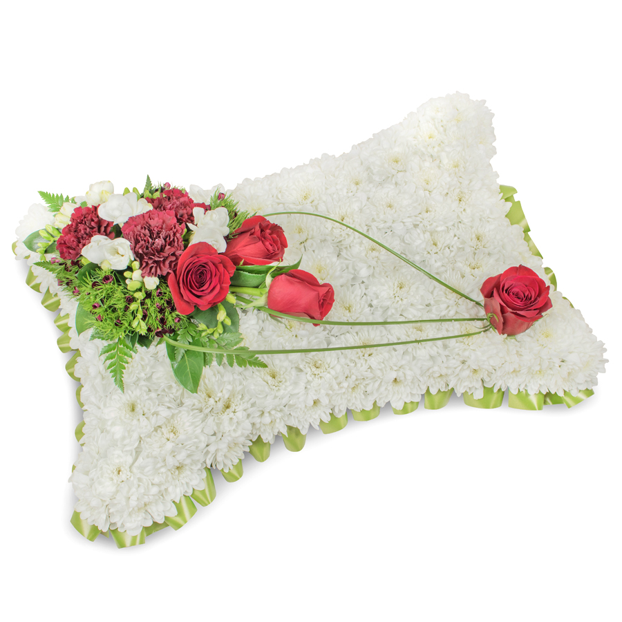 Convey your deepest sympathies with our beautifully crafted bouquet featuring white chrysanthemums, red roses, white freesias, dark red carnations, dianthus, and bear grass. Each bloom is carefully hand-selected to ensure optimal freshness.