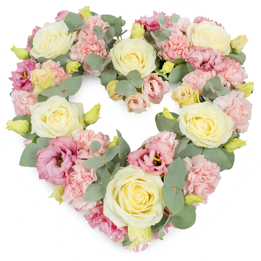 Show your heartfelt condolences with this beautiful heart-shaped bouquet. Featuring luxurious white roses, charming pink carnations, soft pink lisianthus, and fragrant eucalyptus leaves, this arrangement is a perfect symbol of love and remembrance.